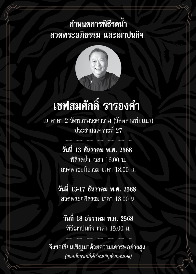 เชฟสมศักดิ์ รารองคำ นายกสมาคมเชฟประเทศไทย ได้จากไปอย่างสงบ